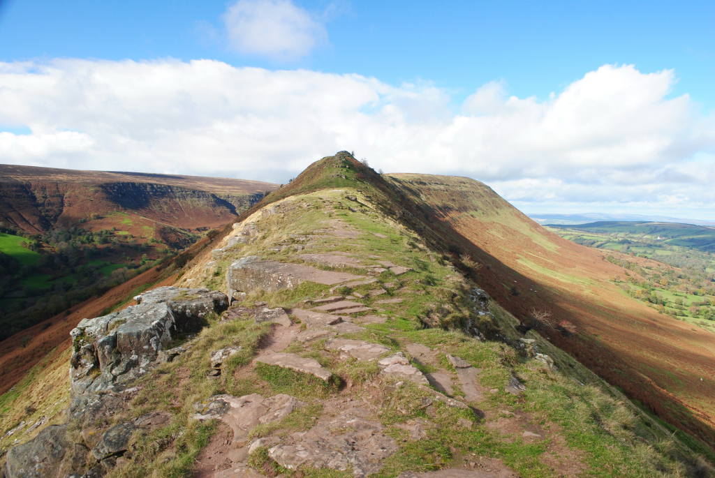 Although this is your onward route, you can, if you like, extend the walk by following the top path for a further 2½ kms to reach Hay Bluff (marked by another trig point) – another fine viewpoint. If you decide to do this, keep to the path along the top of the ridge, and ignore the obvious flagged path that bears off to the right. Return to the junction by retracing your steps.